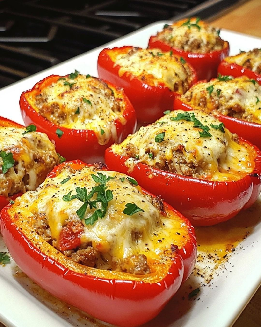 Teneri peperoni ripieni di pollo e formaggio cremoso, ricoperti di formaggio e serviti su un letto di pomodorini.