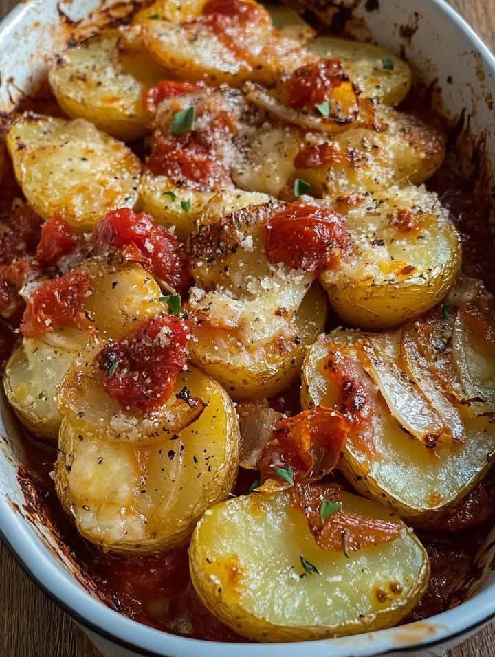Assemblare il piatto: In una teglia, distribuisci uno strato di sugo, aggiungi le fette di patate e coprile con altra salsa di pomodoro. Alterna strati fino a terminare gli ingredienti.