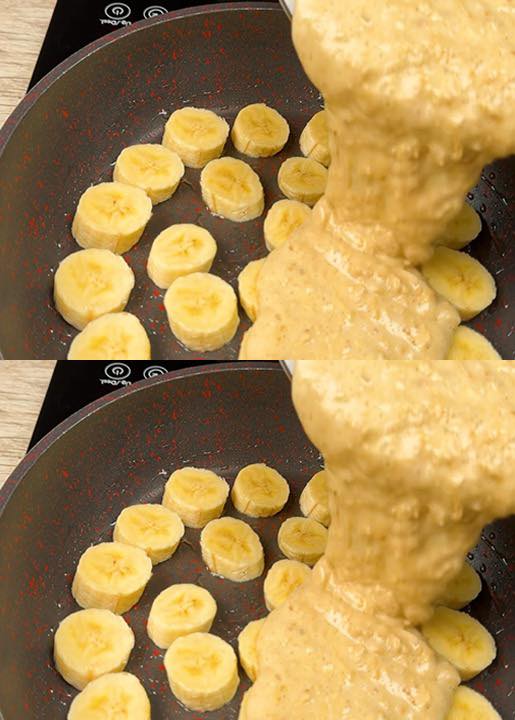 Scaldate una padella antiaderente con un filo d’olio. Adagiate le fette di banana precedentemente tagliate, sistemandole bene in modo che si adattino tutte alla padella.