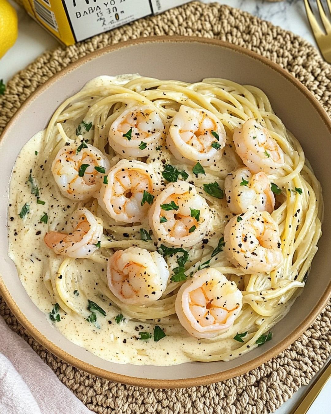 Spaghetti con teneri gamberi in una cremosa salsa al Parmigiano. Veloci, facili e sempre un successo.