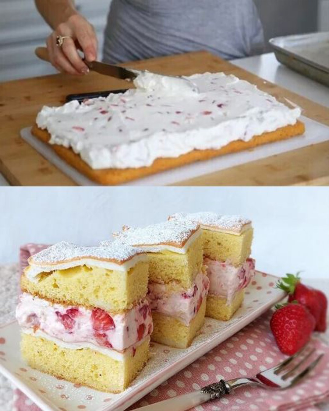Queste fette di fragole “Sogno di Fragole” sono la ricetta perfetta se avete voglia di un dessert fruttato e cremoso, senza fronzoli! Una torta soffice e leggera con una delicata meringa, una cremosa panna montata alla vaniglia e fragole e un leggero tocco di marmellata: il tutto per creare una torta estiva da sogno che si scioglie in bocca. Che sia per un caffè, un buffet di torte o semplicemente come dolcetto tra un pasto e l’altro: queste fette saranno sicuramente un successo e faranno brillare gli occhi di tutti a tavola!
