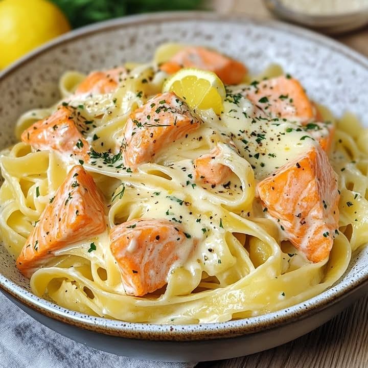 2️⃣ Preparate il salmone: prendete il salmone congelato e mettetelo in una pentola con acqua leggermente salata. Lasciate cuocere il salmone a fuoco medio per circa 8-10 minuti. Una volta cotto, togliete il salmone, tagliatelo a pezzetti e conditelo con 15 g di succo di limone per dargli un tocco fresco.