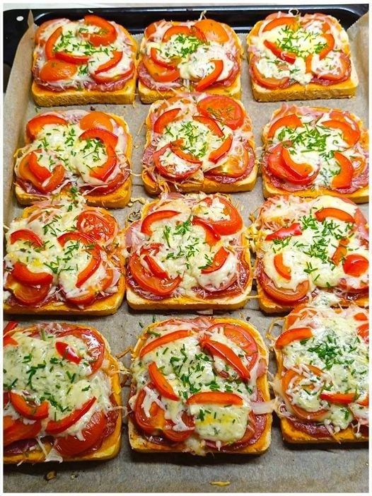 Per prima cosa, tostare leggermente le fette di pane tostato in modo che rimangano croccanti durante la cottura ed non si inzuppino a causa dei pomodorini. Quindi disporre le fette tostate in un grande quadrato su una teglia foderata con carta da forno, leggermente a contatto.