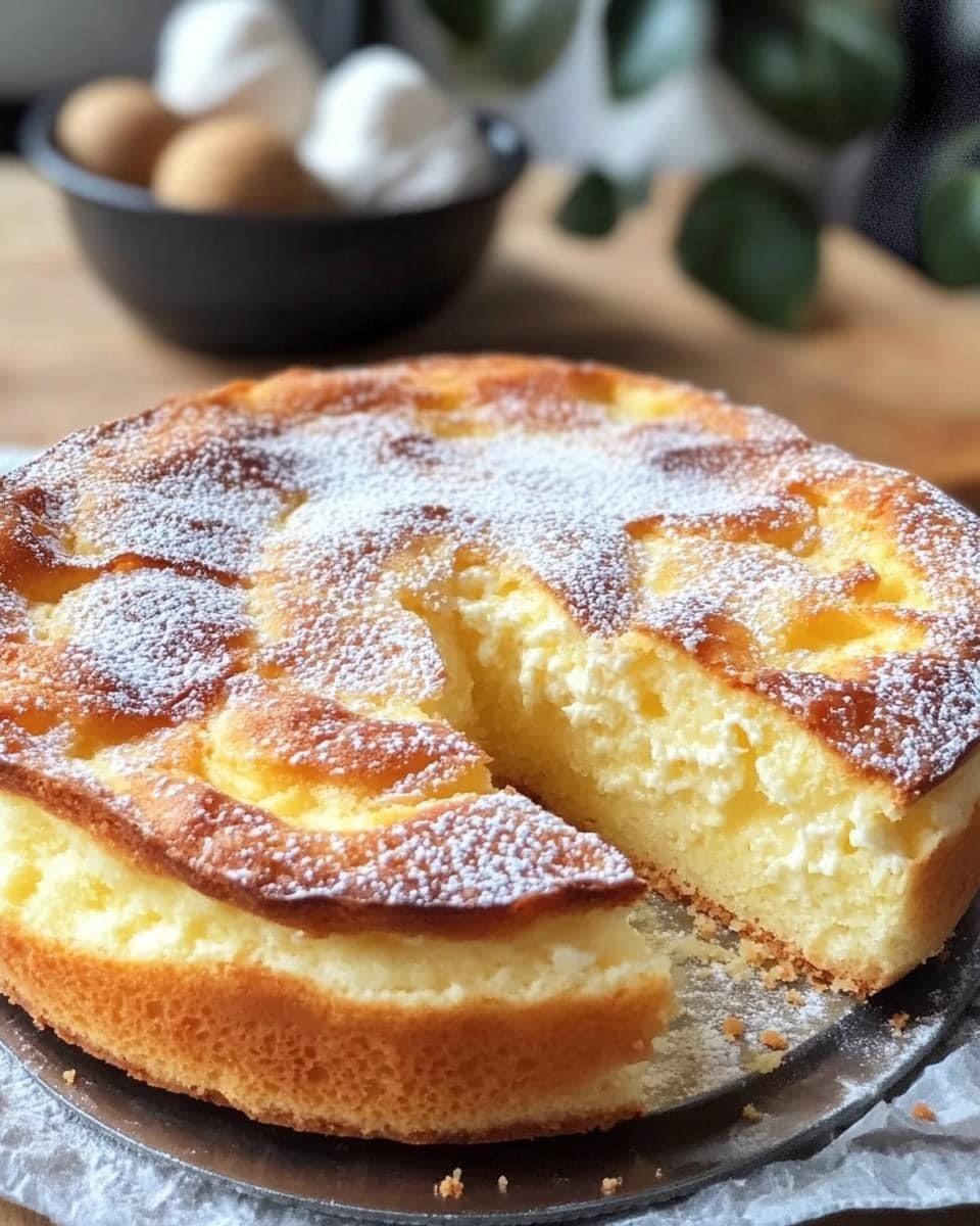 Questa torta è un vero capolavoro di semplicità. Non sono necessarie tecniche complicate o ingredienti difficili: tutto ciò che serve è un po’ di pazienza e la tecnica giusta. Dopo la cottura, arriva il momento magico in cui la torta si rivela in una crosta dorata che si armonizza perfettamente con l’interno morbido, quasi fondente. La torta è perfetta da spolverare con zucchero a velo, che aggiunge un tocco di eleganza e ne completa il sapore.