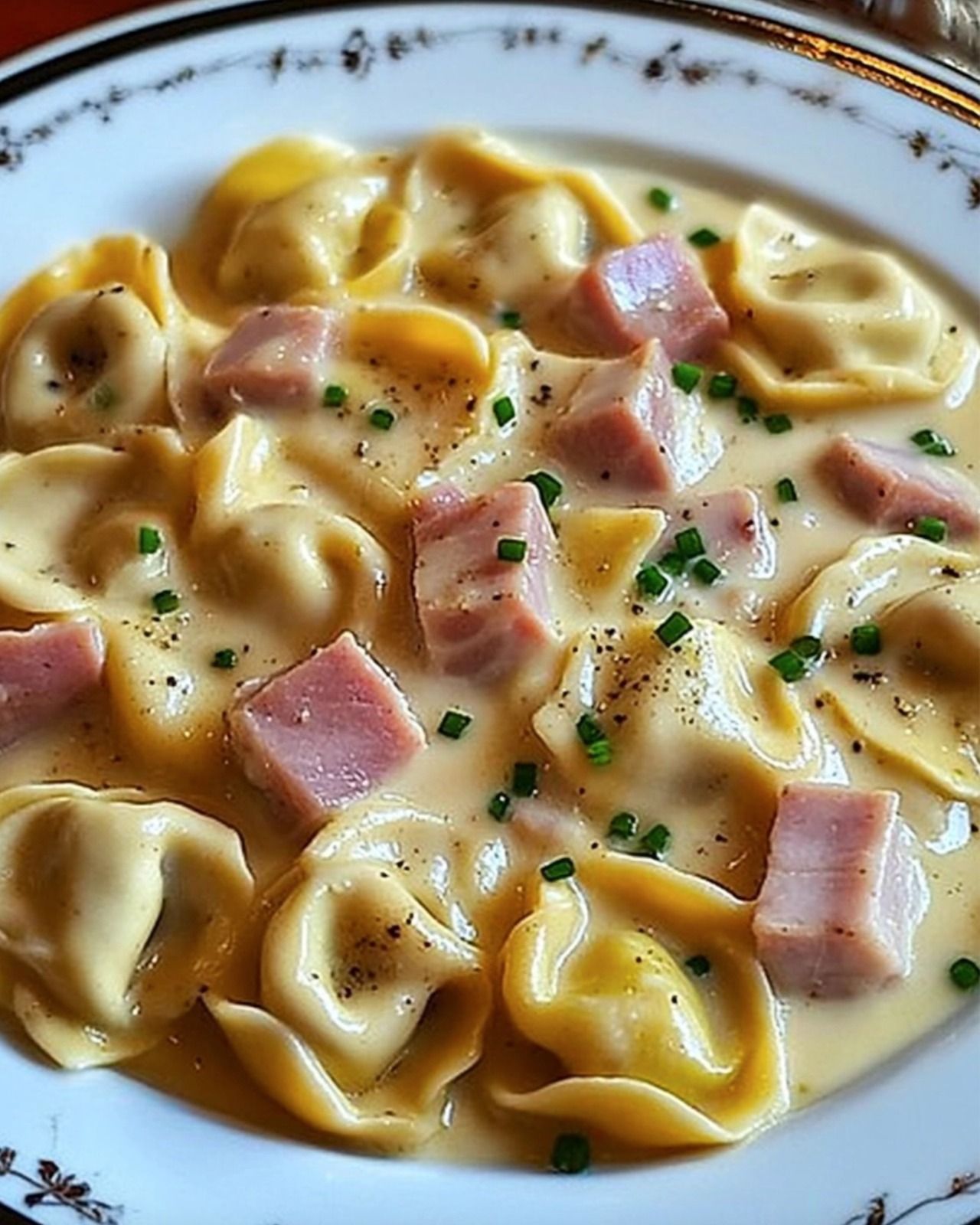 Tortellini in salsa di prosciutto, formaggio e panna, pronti in pochi minuti e una vera delizia per gli amanti della pasta